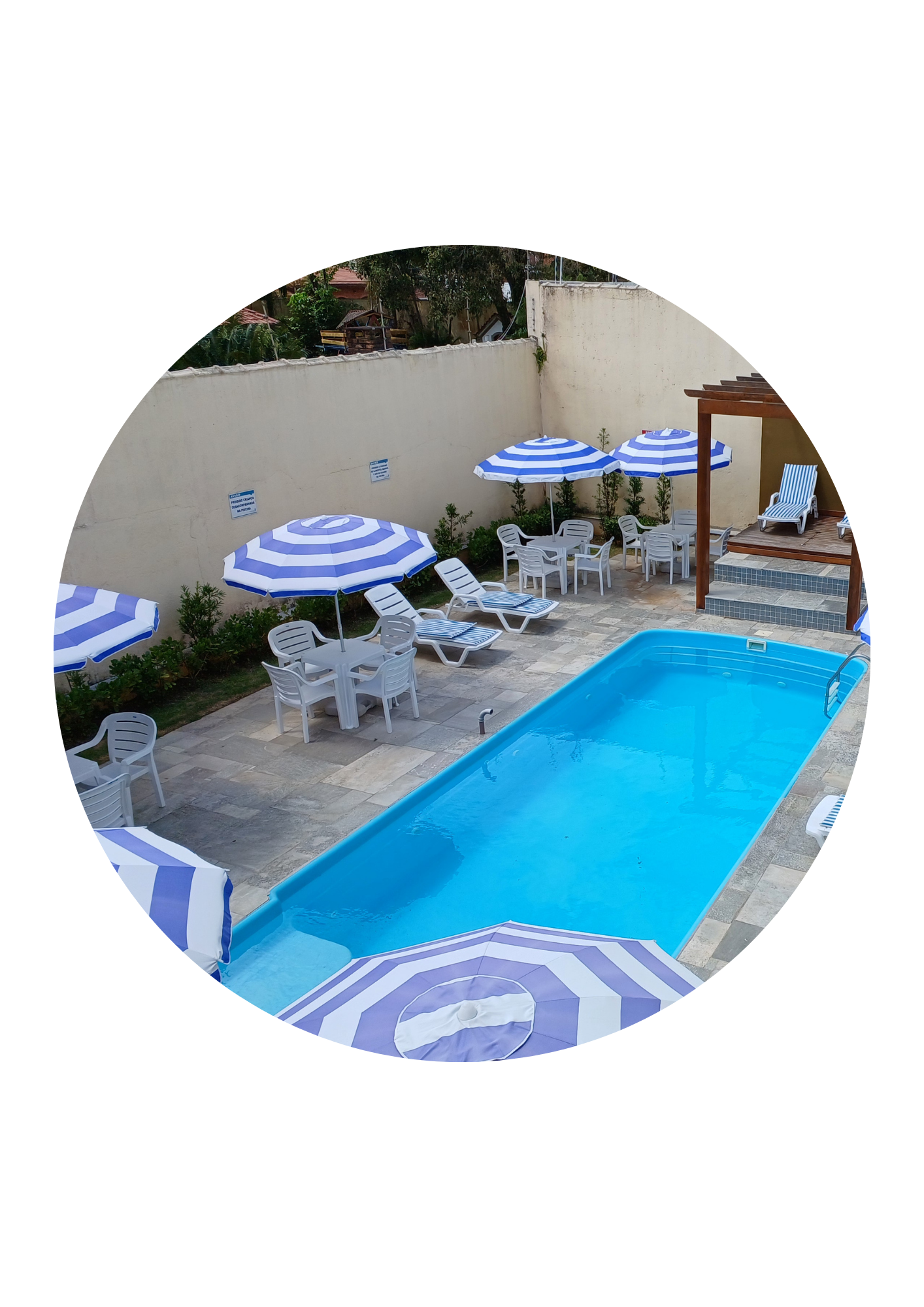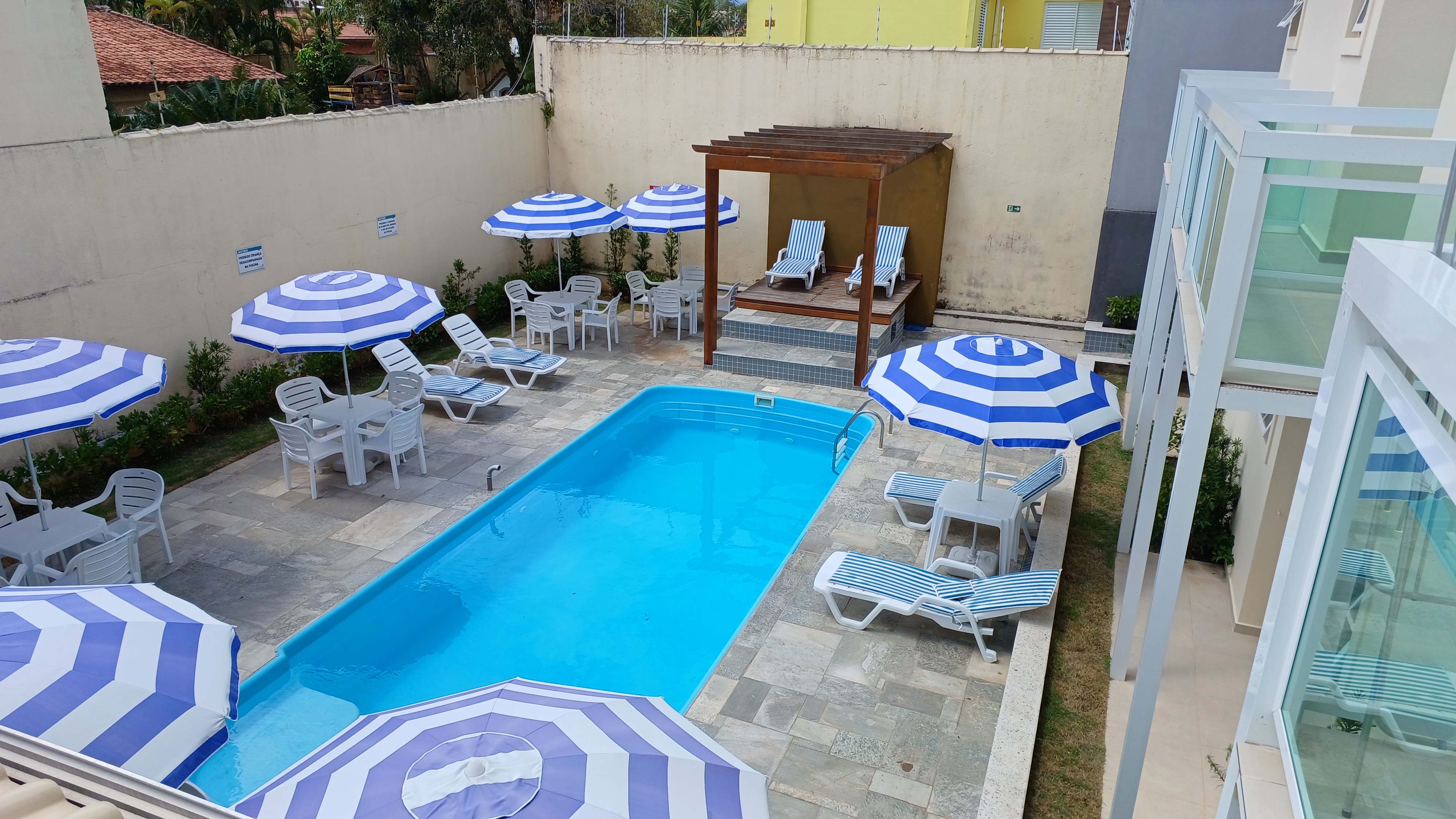 A estrutura conta com uma piscina, bar e espaços de convivência, além de possuir serviço de alimentação própria: café da manhã, almoço e jantar são preparados na própria colônia e já estão incluídos na diária.
